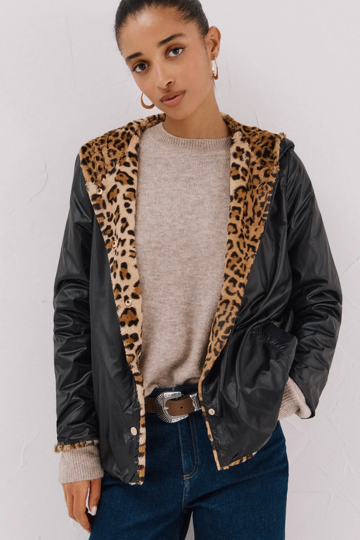 – Combina calidad ligera de efecto pelo y tejido técnico.