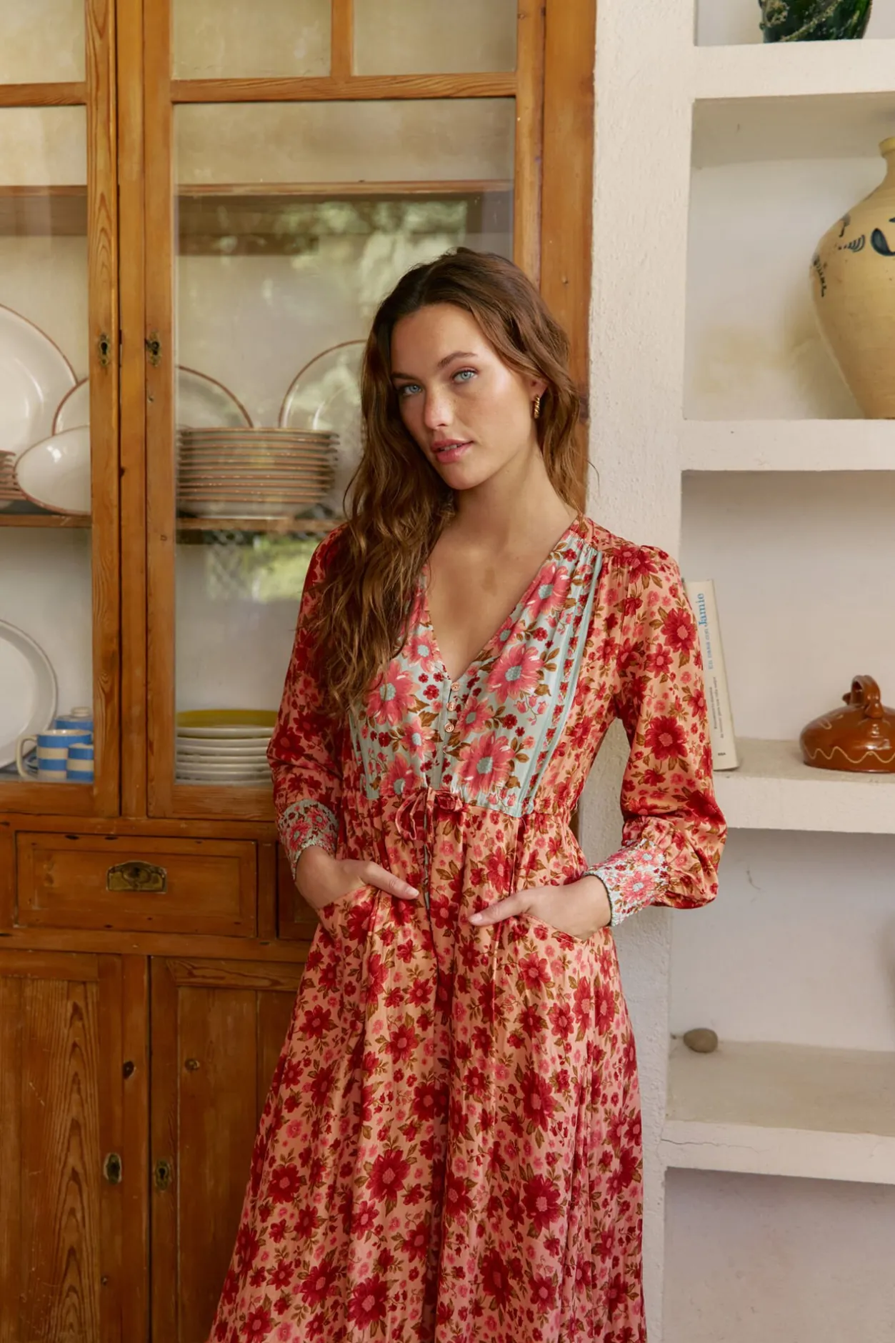 – Escote en V con cierre de botones en la parte frontal
