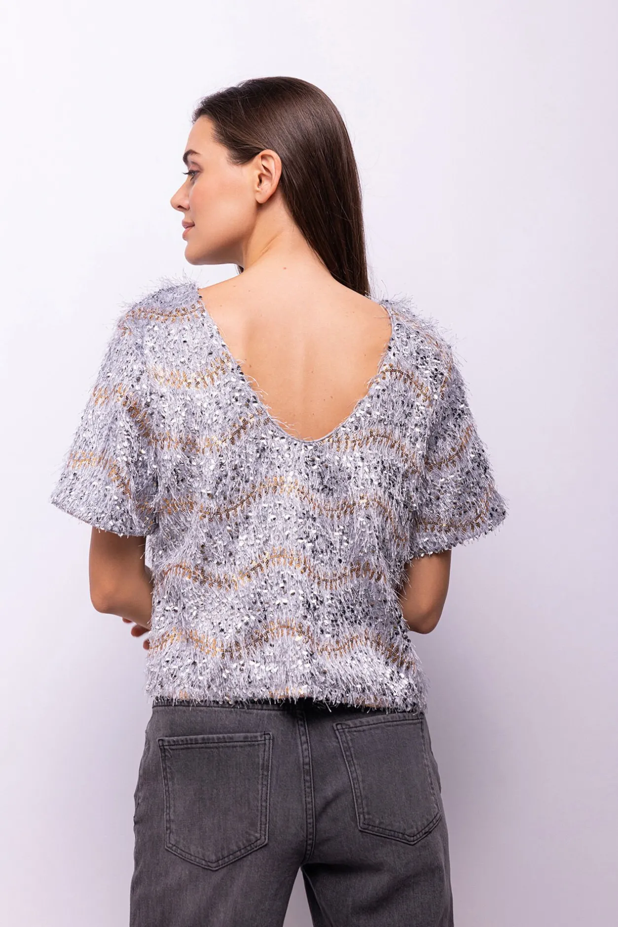 – Cuello redondo y escote en v en espalda