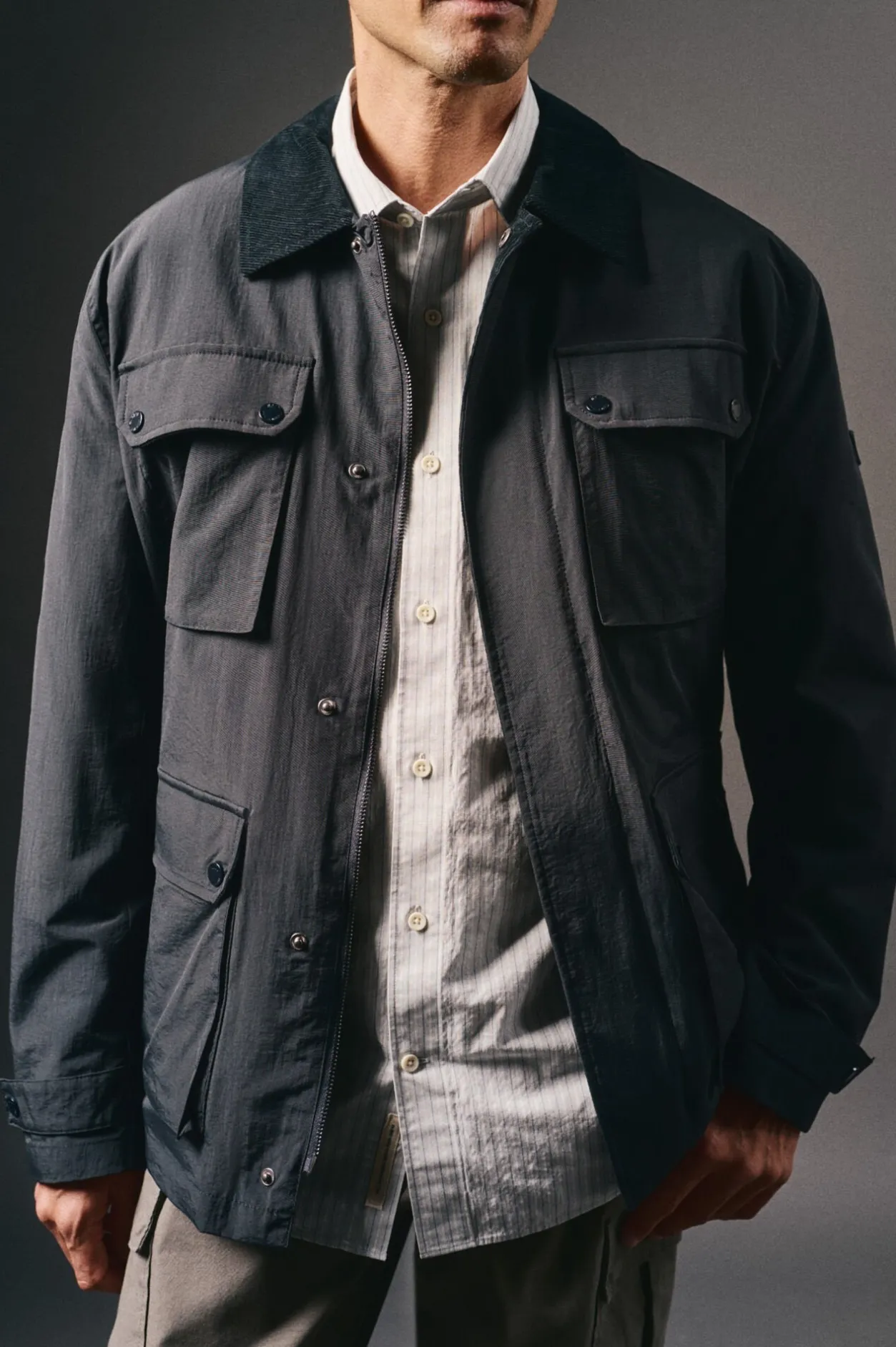 -Cazadora con cierre con cremellera y broches, cuello de pana combinado a contraste, 4 bolsillos exteriores con cierre con broches.