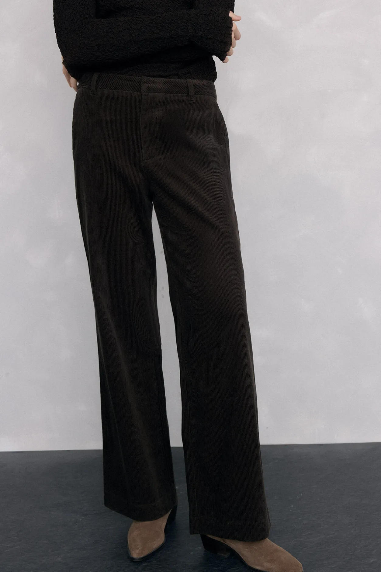 – Cierre mediante cremallera metálica semiautomática oculta por tapeta y enganche Trabillas para cinturón