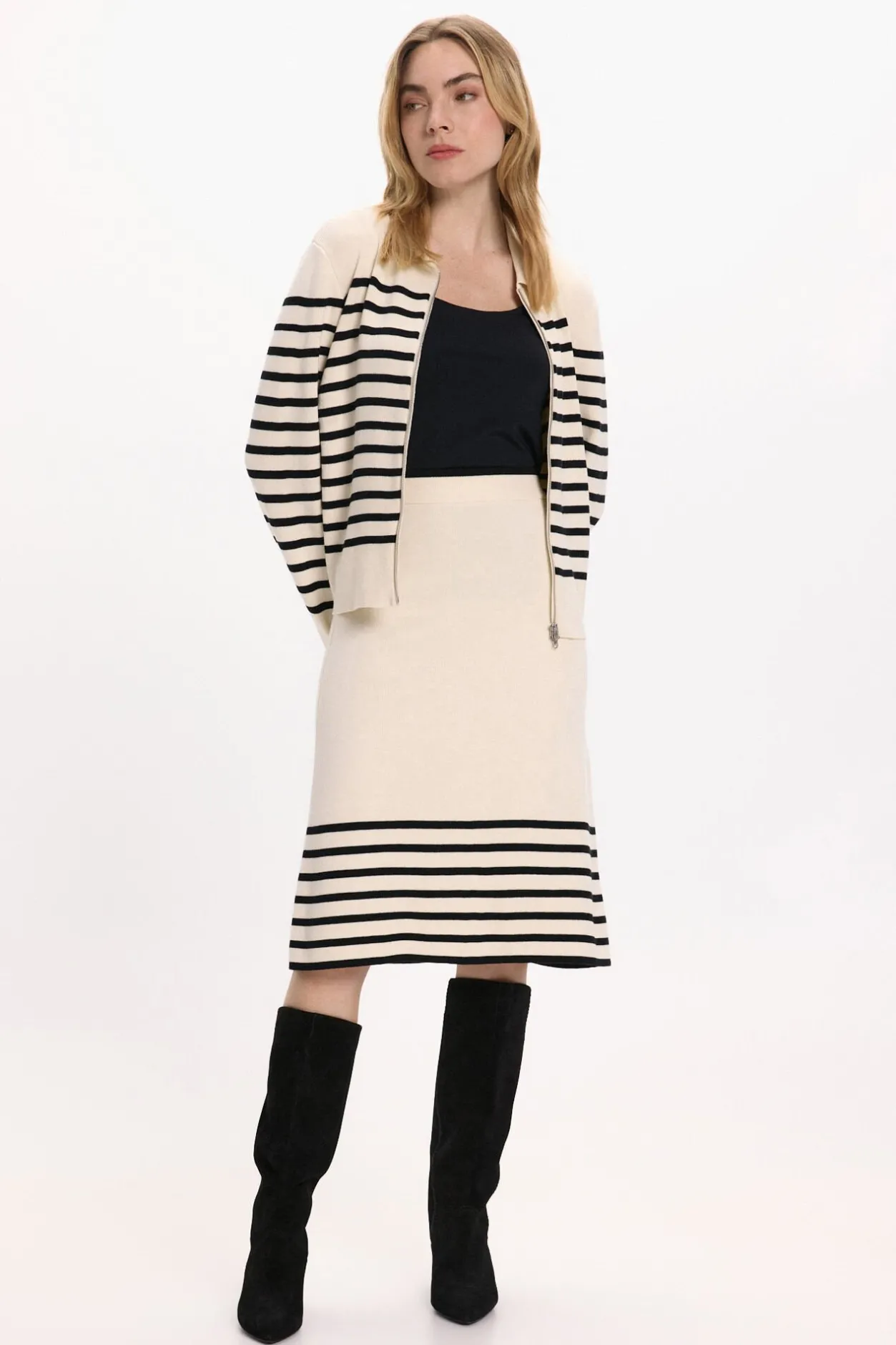 – Detalle de rayas en la parte baja y en la cintura