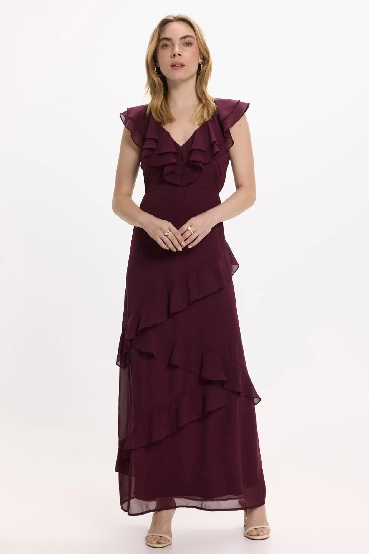 – Escote en forma de pico con volantes