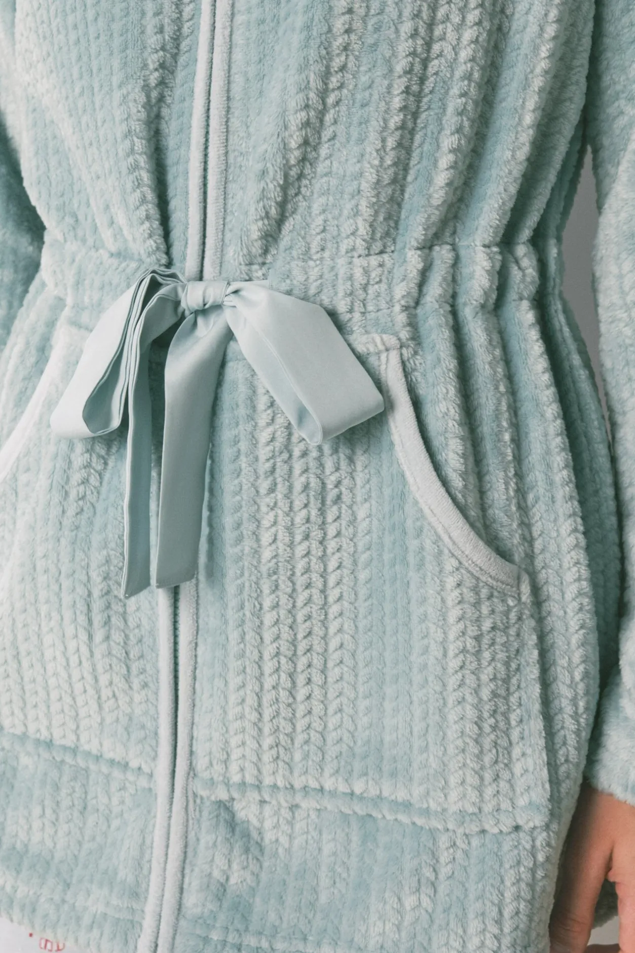 – Lleva bolsillos tipo «canguro» a los laterales y una lazada de satén a la altura de la cintura para ajustar.