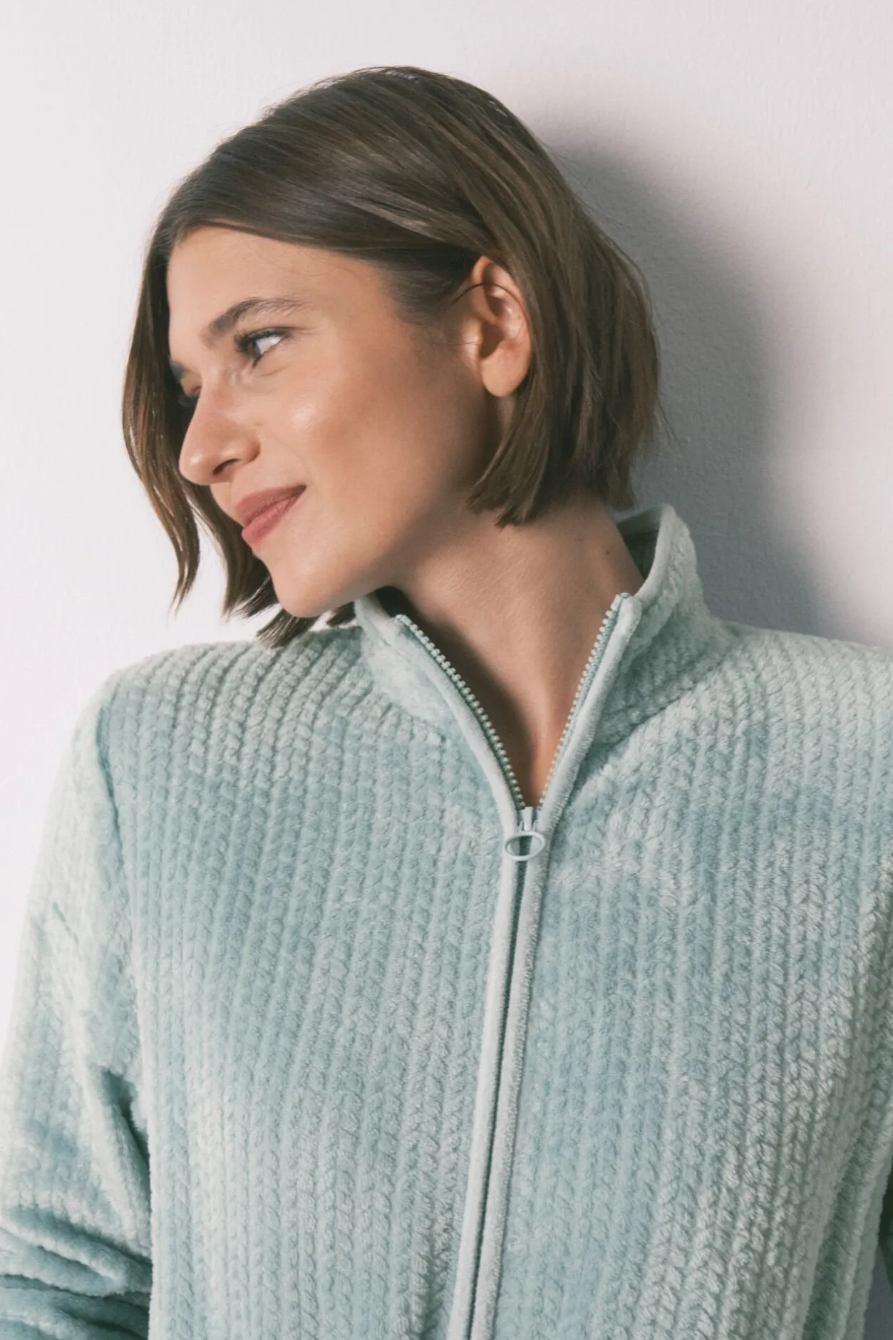 – Con cuello alto y cierre frontal de cremallera.