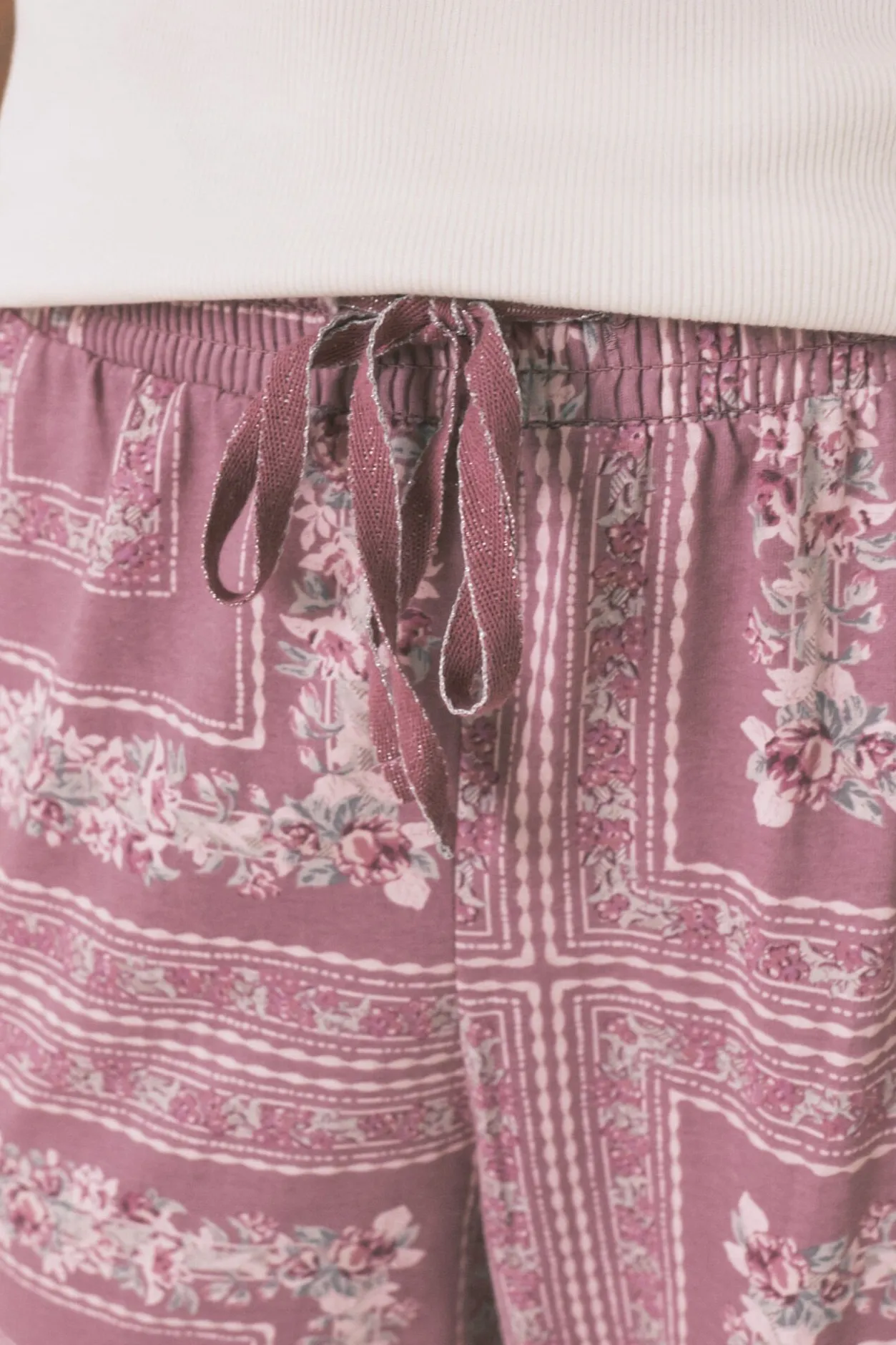 – Pantalón lounge con estampado allover de cenefas florales, cinturilla elástica de punto smock regulable mediante cordón a tono y cenefa a contraste en bajos.