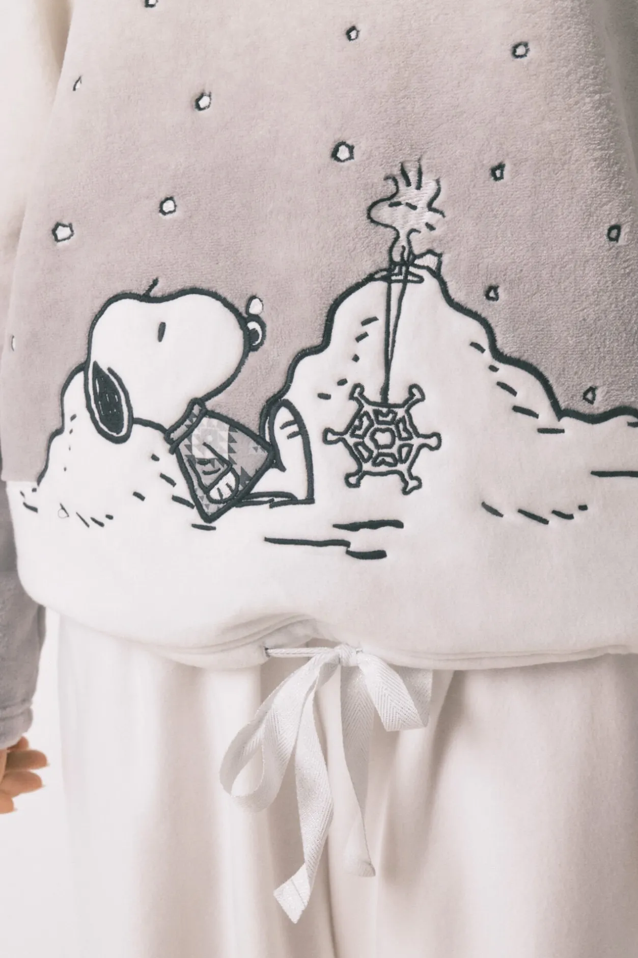 -Parte de arriba con estampado degradado de Snoopy, escote redondo y mangas caídas con puño del mismo tejido. Cinturilla regulable mediante cordón a tono.