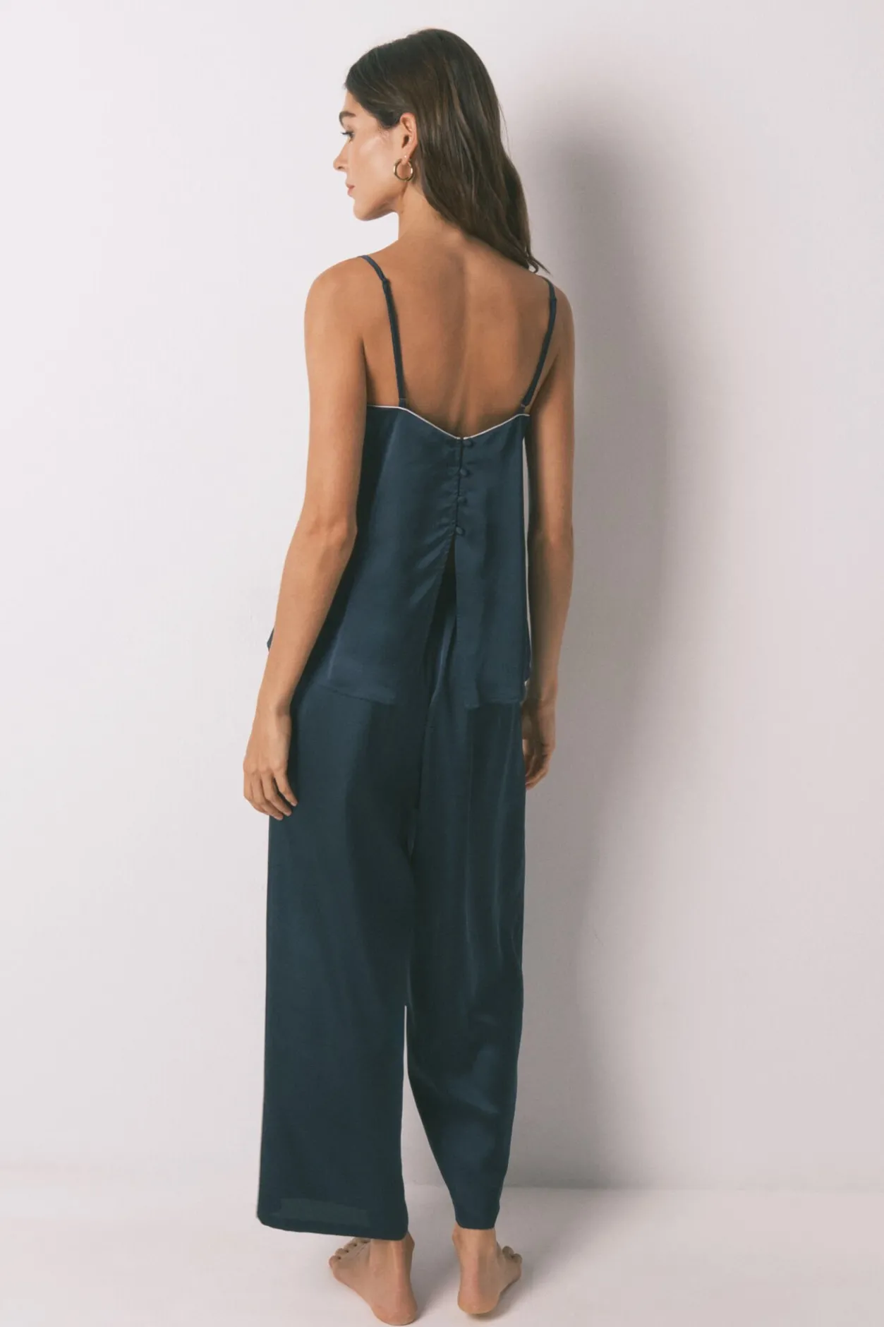 – Pantalón holgado con cinturilla elástica regulada con cinta a tono.