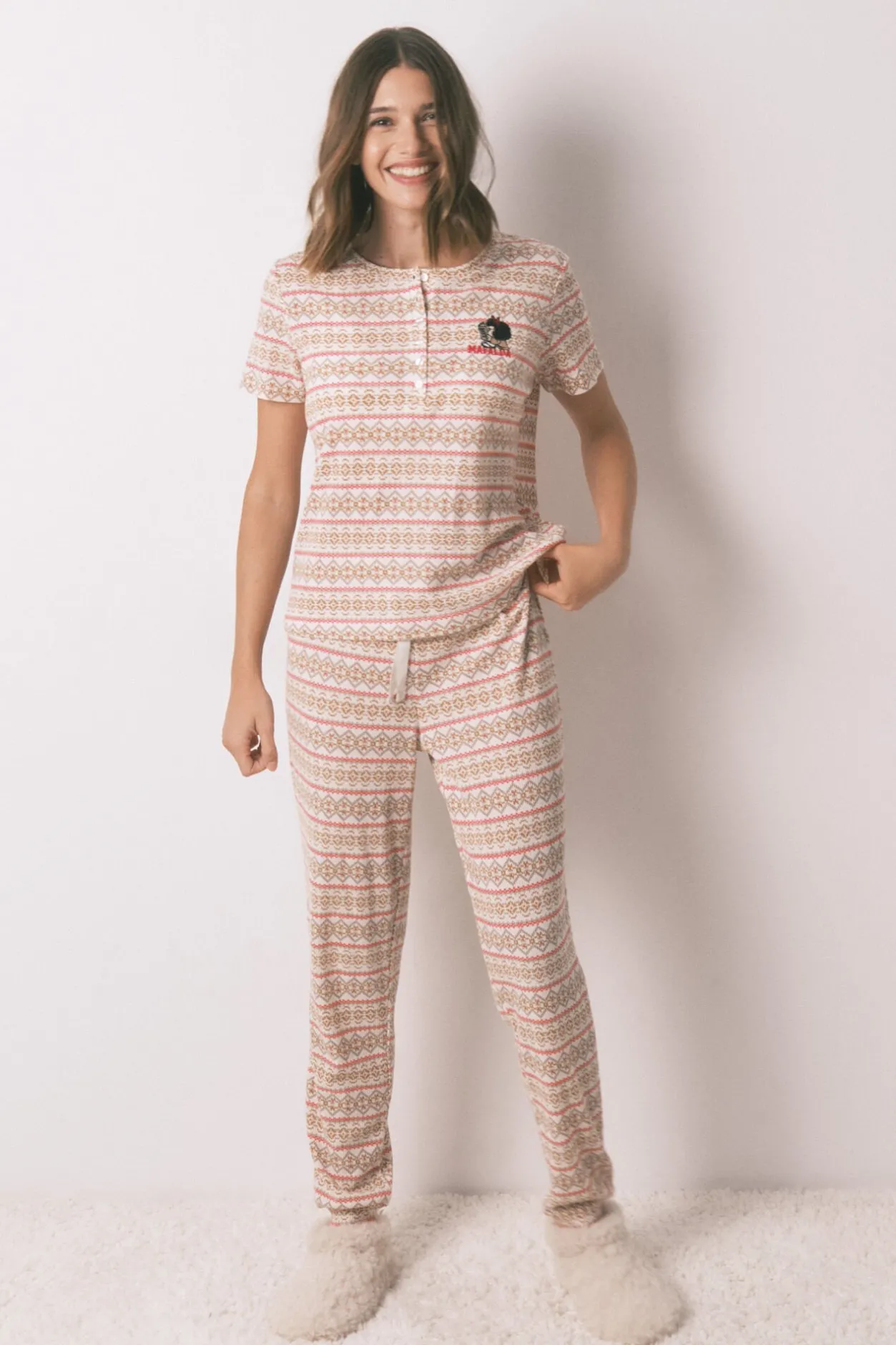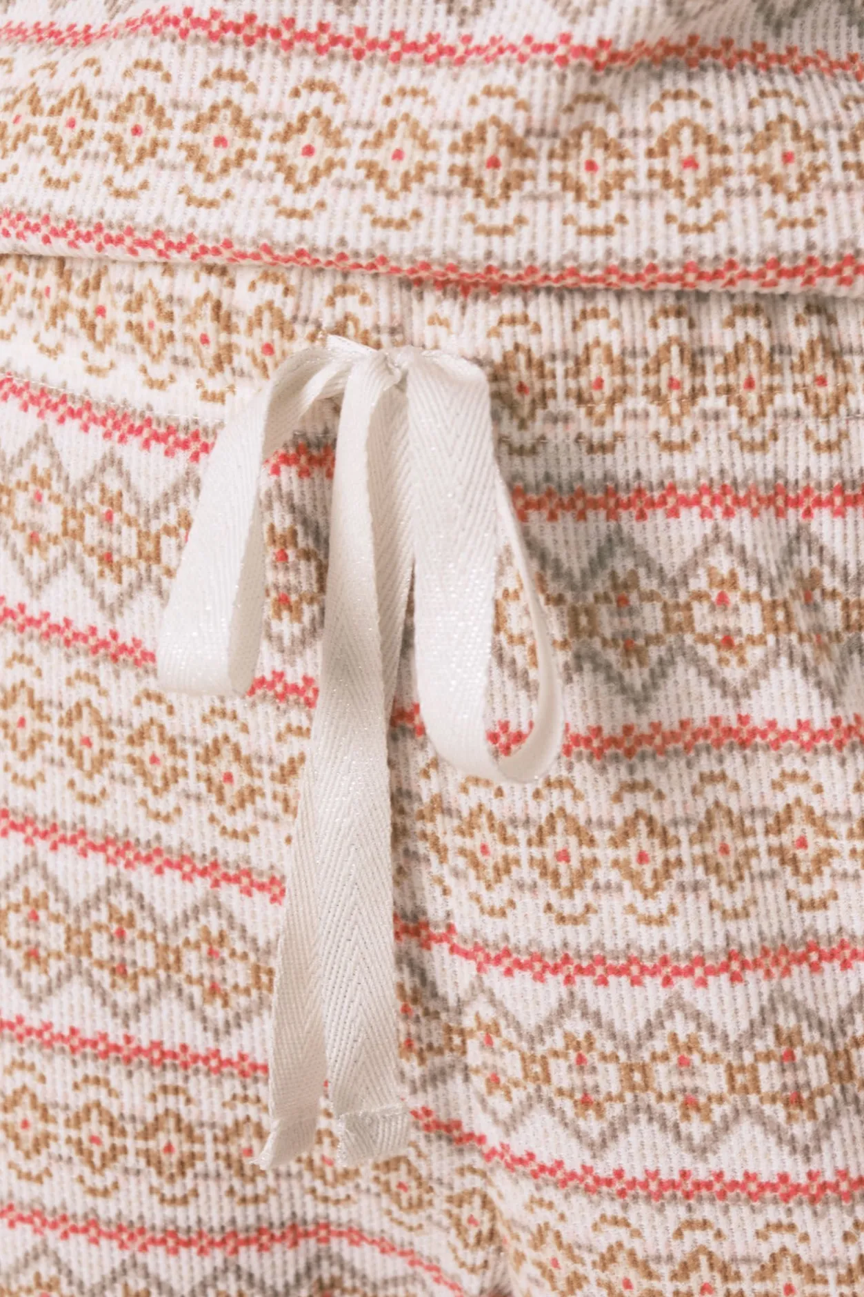 – Pantalón ajustado con detalle de puños del mismo tejido y cinturilla elástica regulable mediante cordón a tono con lurex.