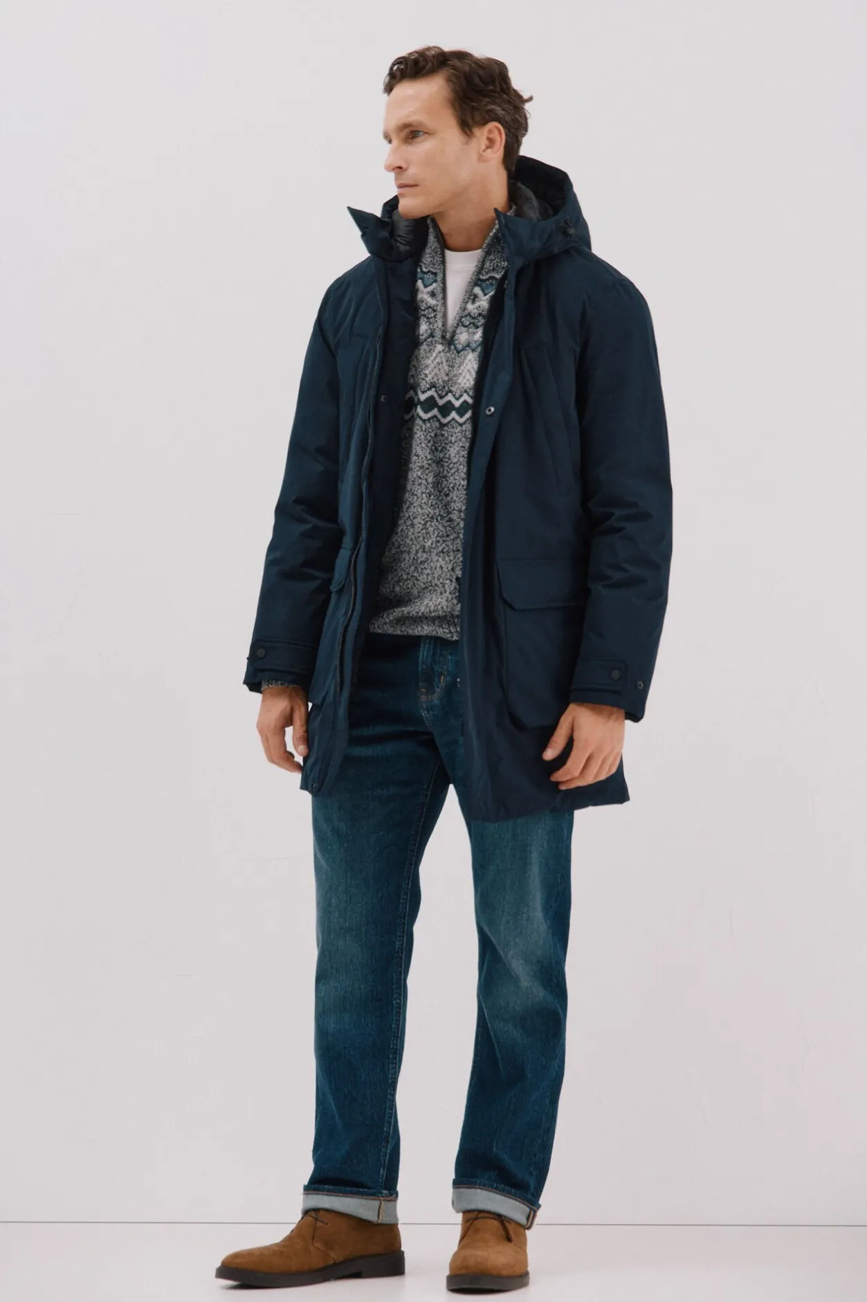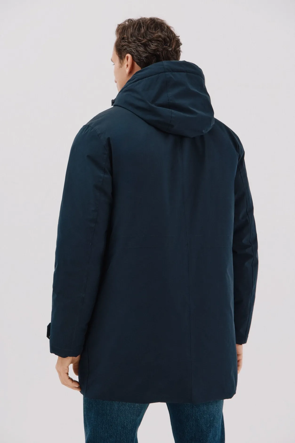 -Parka confeccionada en tejido técnico repelente al agua. Cuello alto con capcuha. Cierre delantero con botones de broche y cremallera. Puños con cierre broche. Dos bolsillos laterales de ribete en pecho y dos bolsillos bajos de plastrón. El relleno interior contiene fibra Thermolite.