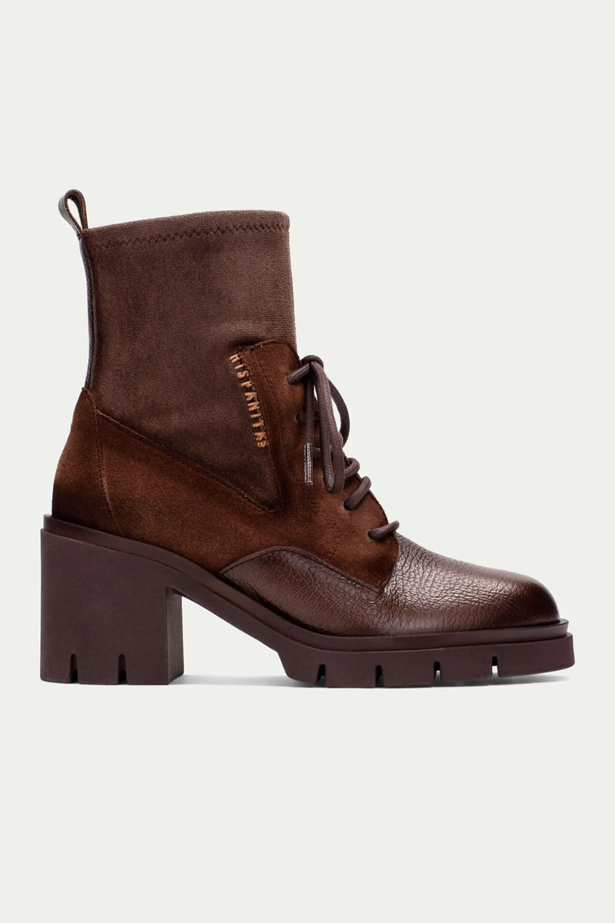 – Elaborado en piel texturizada, serraje y serraje que combina tejido elástico