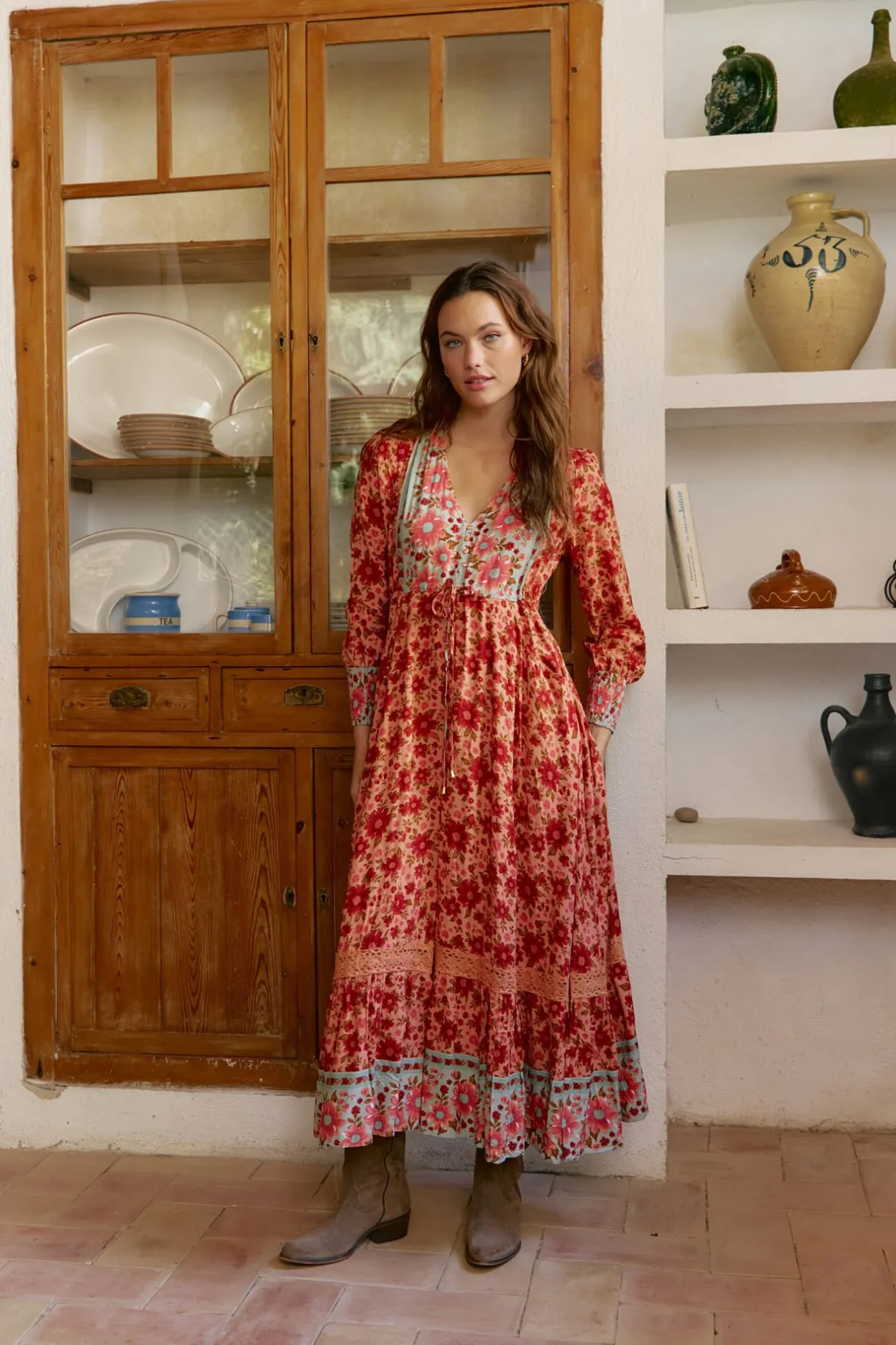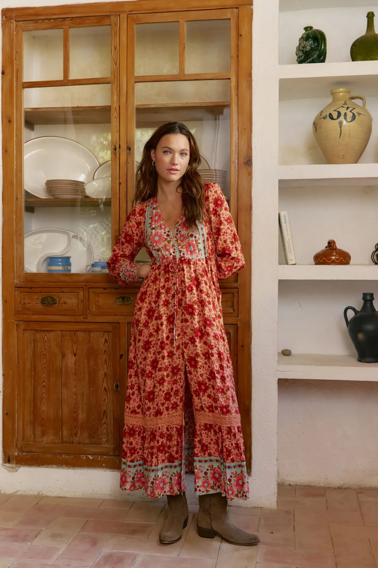 – Escote en V con cierre de botones en la parte frontal