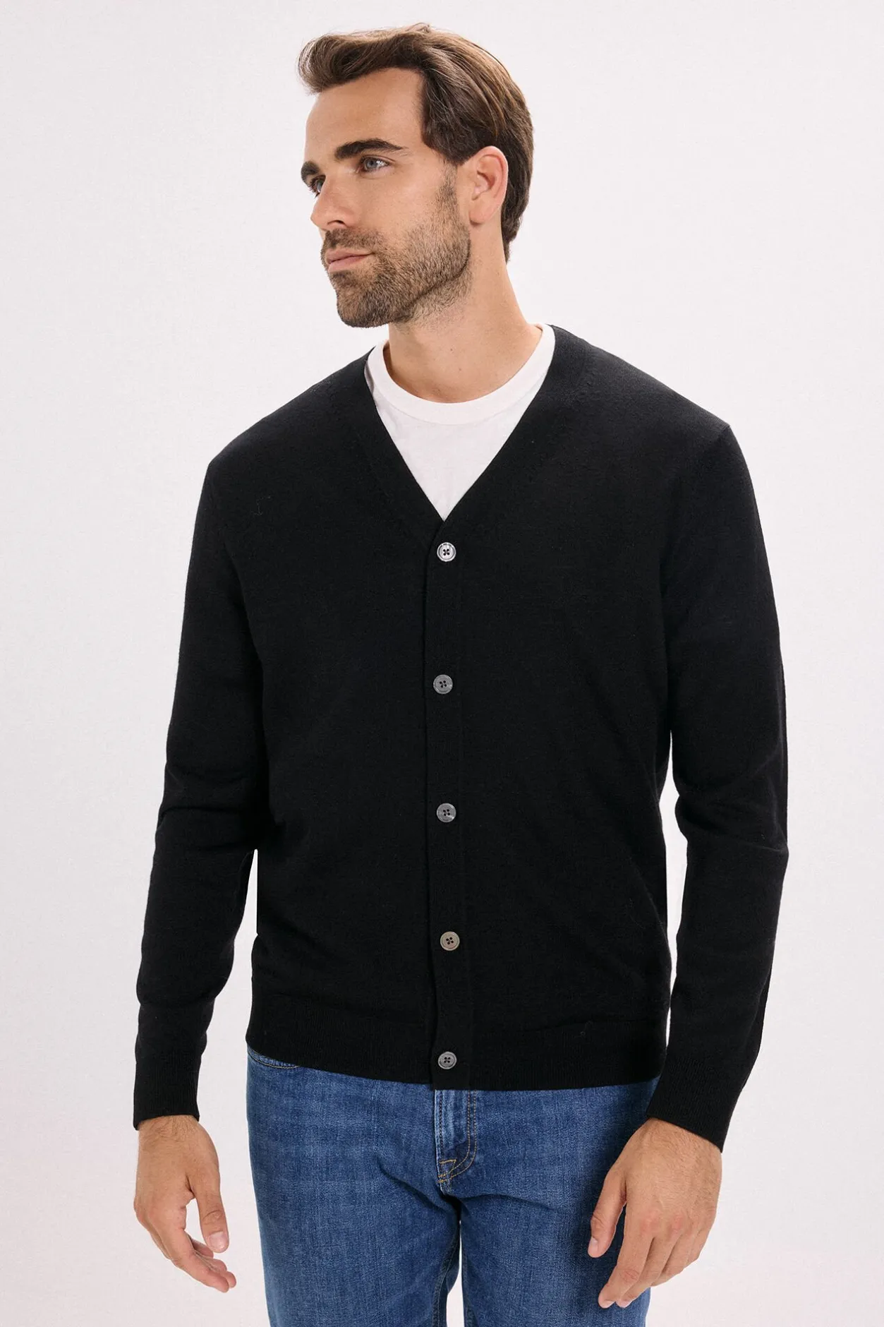 -Cuello pico y cierre delantero con botonadura