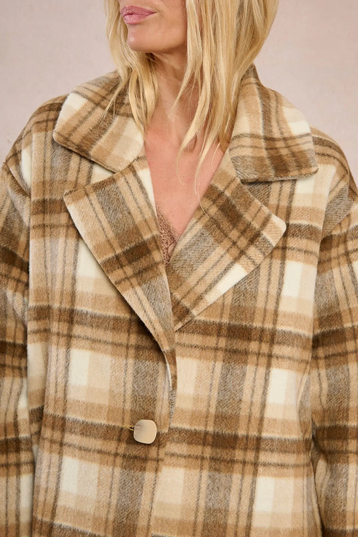 – Modelo de corte recto, con estampado de cuadros y cierre de botón frontal.