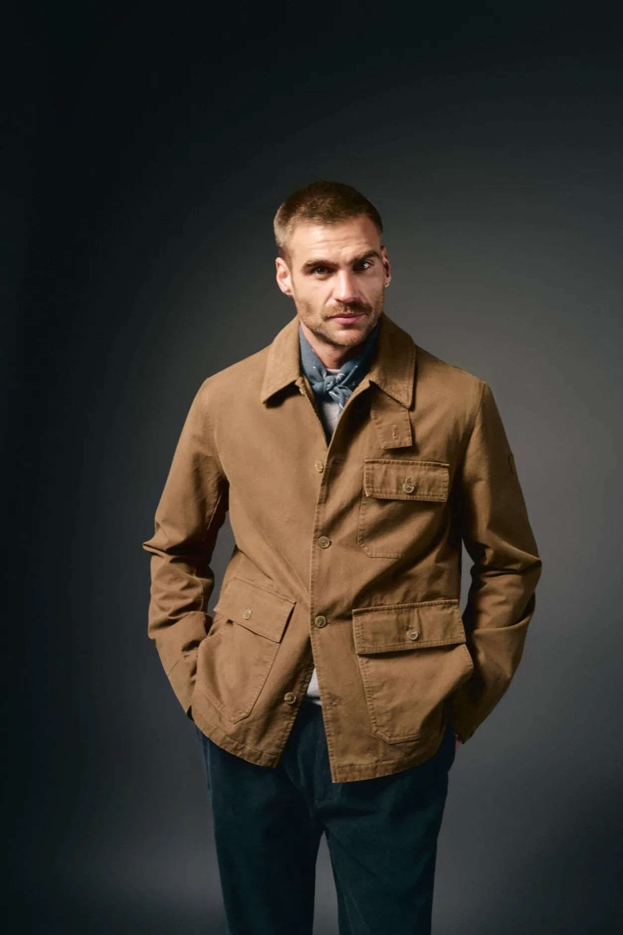 -Cazadora con cierre con cremellera y solapa con broches, cuello de pana combinado a contraste, 2 bolsillos exteriores con cierre con broches