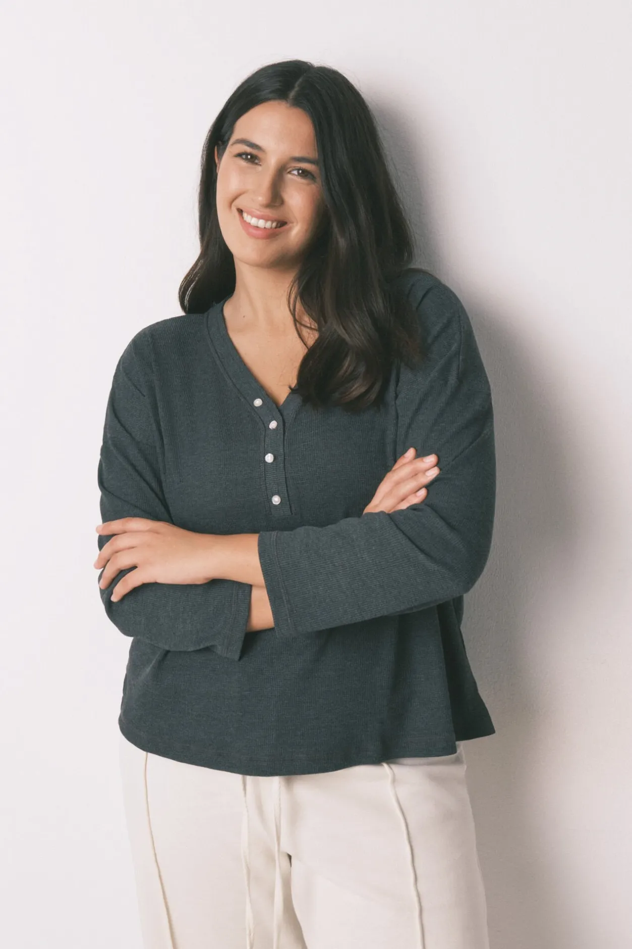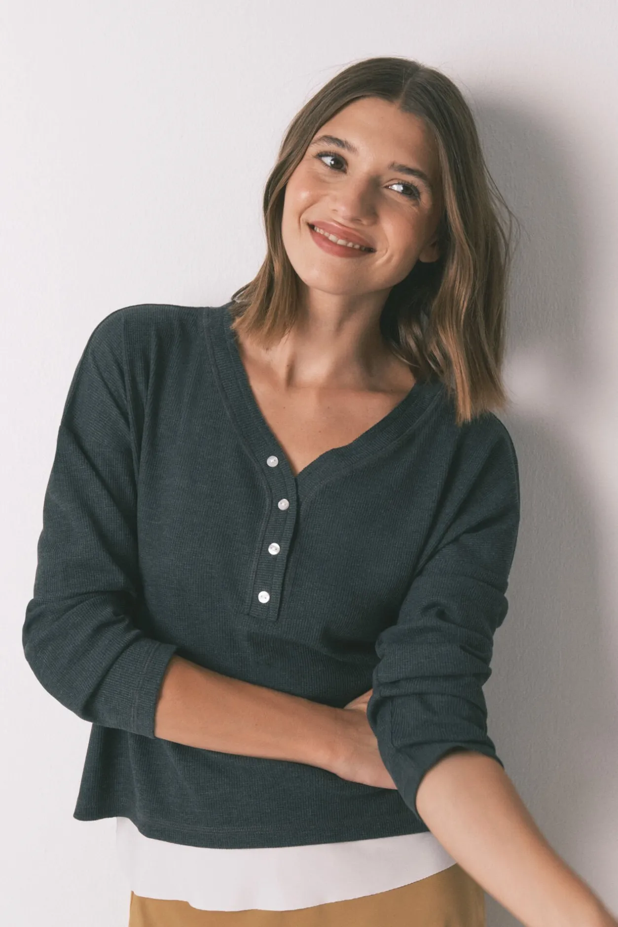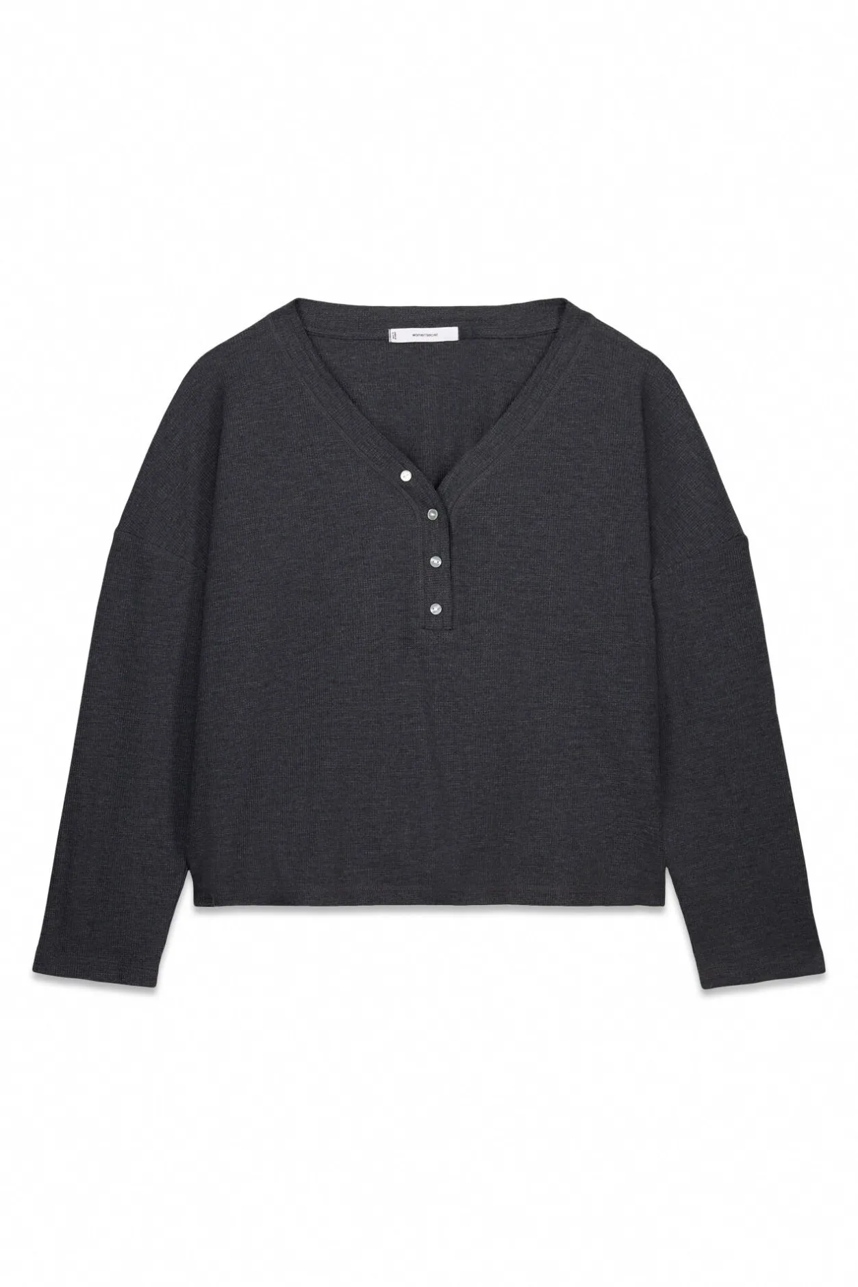 – Con escote en pico pulido con vivo elástico y abrochado con botones a tono.