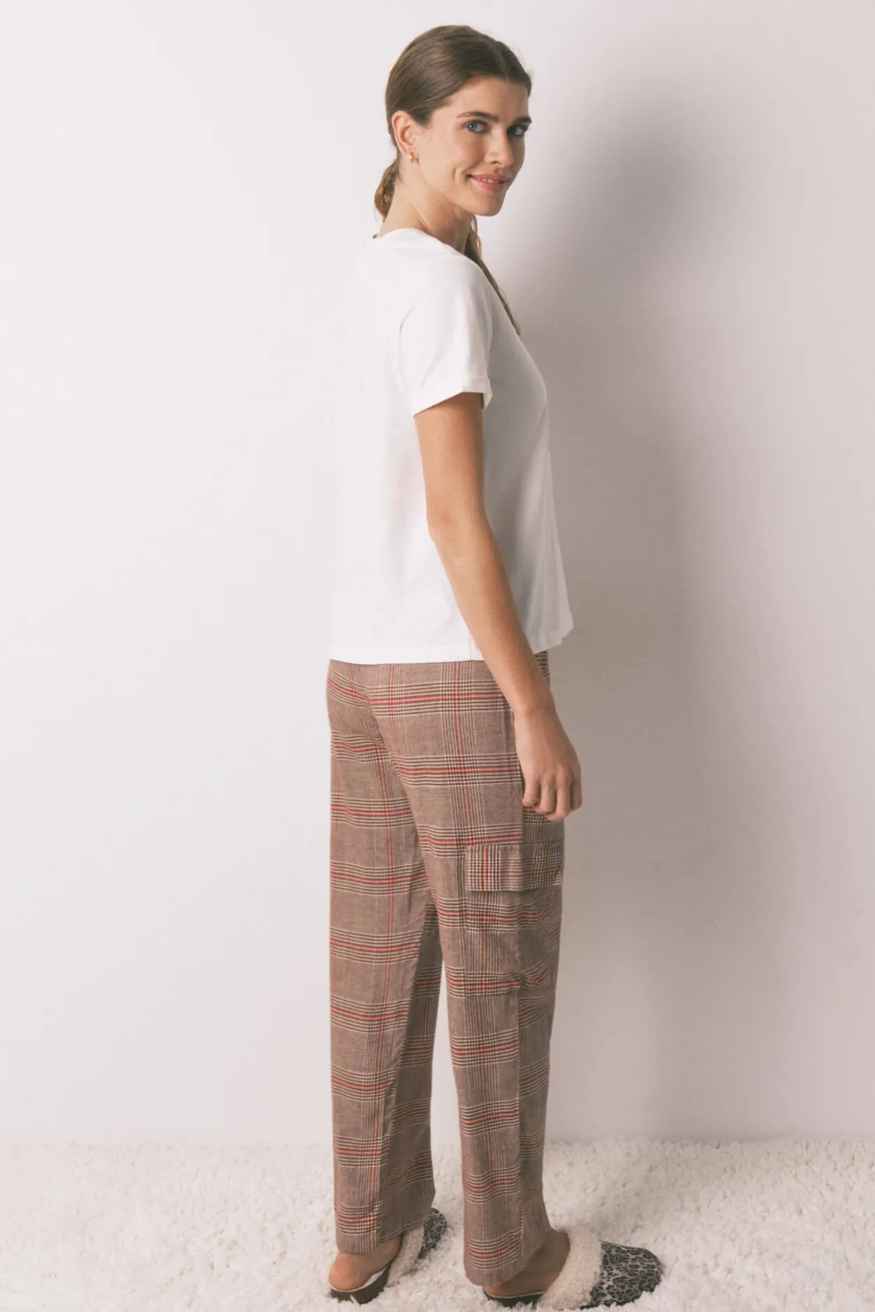 – Pantalón ancho, con estampado de cuadros, bolsillos tipo cargo en laterales y cinturilla elástica en animal print con detalle de etiqueta a contraste.